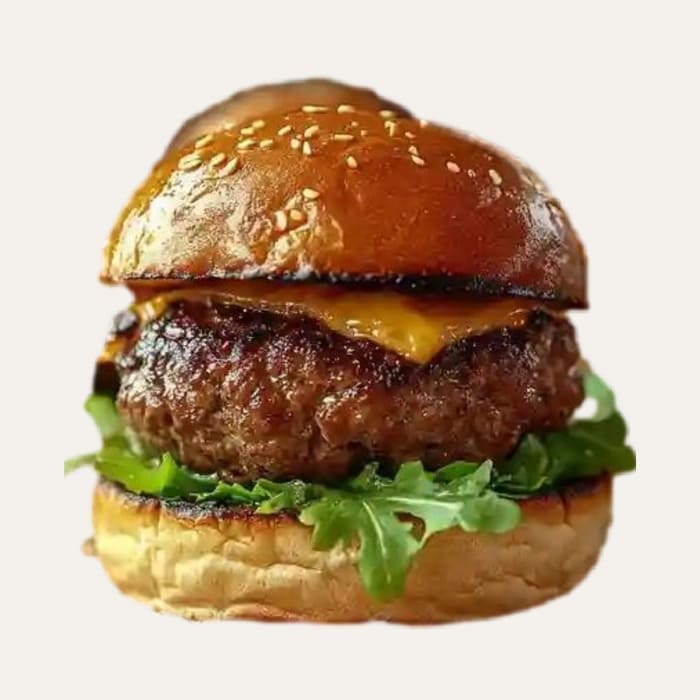 Notre recette met l’accent sur la qualité de chaque ingrédient. D’abord, nous sélectionnons un steak épais de bœuf de race française, que nous cuisons à la perfection pour qu’il reste incroyablement juteux. Ensuite, nous le surmontons d’un carré de cheddar fondant et de notre sauce barbecue maison aux notes délicatement fumées. De plus, pour la fraîcheur, nous ajoutons de fines rondelles d’oignon rouge et une tranche de tomate. Finalement, une feuille de roquette vient apporter sa touche poivrée. Le tout servi dans un mini bun artisanal aux graines de sésame, moelleux et juste toasté.